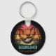 Porte - clé rond de Daydreaming Cool Cat's Tropical Escape : Un chat noir portant des lunettes de soleil et une chemise hawaiienne, allongé dans un hamac entre deux palmiers, avec un coucher de soleil rétro dans l'arrière - plan.