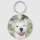 Terrier pitbull blanc avec un grand sourire heureux sur le visage et fleurs sauvages dans l'arrière - plan amoureux de les chiens porte - clés