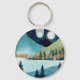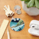 Un magnifique paysage aux textures uniques qui montre un paysage lacustre de montagne avec une lune montante et un ciel étoilé dans les tons bleu, or, vert et turquoise.