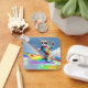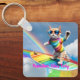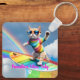 Une image de haute qualité, numériquement rendu, avec un gingembre anthropomorphique et un chat blanc dans une pose d'action de corps entier. Le chat est parfaitement équilibré au-dessus d'une planche de surf arc-en-ciel brillamment colorée, son regard refroidi caché derrière des lunettes de soleil réfléchissantes de couleur orange. Il est doté d'un dessus à manches courtes et douillet à rayures arc-en-ciel. L'ensemble de la scène se déroule sur un fond gris pâle et simple pour souligner les couleurs et le mouvement frappants du sujet.