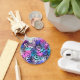 Un petit oiseau drôle dans le coin supérieur gauche et des éléments floraux sur un arrière - plan rose, violet et turquoise.