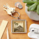 Cette image vintage de la grande pyramide de Gizeh en Egypte est combinée avec des couches de plâtre et de peinture, pour créer un porte-clés folâtrant le style de signature de Tina Chaden. Ce grand point de repère est embelli avec une frontière décorative influencée par les peintures de mur égyptiennes de la période.