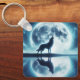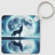 Un loup au bord d'un lac hurlant à la pleine lune, son reflet vu dans l'eau, par martinspixs.