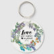 Un porte - clé inspirant des écritures dépeint une jolie couronne d'aquarelle colorée avec des fleurs de pré sauvages dans les tons violet, bleu et orange et vert. Il présente la Bible Verse Mark 12:31, "Aimez votre prochain comme vous-même."