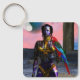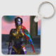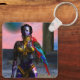 Beauté tatouée noire avec élégante bijouterie dorée avec son perroquet rouge coloré, sous le ciel cosmique rose avec planètes bleues.Cadre d'animation artistique de Hyperion World 3d animation sci-fi long film.