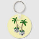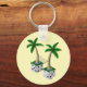 Deux dés blancs avec des palmiers qui poussent au sommet, reliés par un hamac. Les arbres sont également entourés d'herbe et de bassins d'eau qui se déversent sur les côtés des dés.