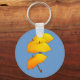 Groupe de parapluies jaunes, aux tons oranges et poignées marron, regroupés sur un arrière - plan bleu.