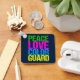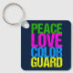 Un joli cadeau de garde colorée pour quelqu'un qui joue le drapeau en tournant avec le groupe de marche à l'école. Peace Love Color Guard est écrit en vert, rose chaud, bleu et jaune néon.