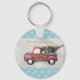 Un porte - clé avec l'image d'un petit camion de jouets mignon avec Joyeux Noël peint à la main sur le côté. Portant un sapin de Noël décoré à l'arrière. Texte : Peace Love & Joy. Placé sur un motif de livre d'argent. Des flocons de neige dans l'arrière - plan.