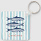 Appréciez l'esthétique de base du pêcheur avec ce porte - clé élégant, avec trois sardines sur bandes bleues turquoises, et texte personnalisable.