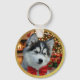 The front of the keychain features a cherished photograph of your pet (e.g., "Rocky," a husky puppy with a red bow). The photo is elegantly framed by a vibrant gold glitter border, while a cozy, blurred Christmas background with sparkling lights and wrapped gifts adds a festive touch. This side is perfect for showcasing your pet's adorable personality.