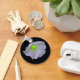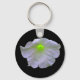 Ce joli porte - clé présente une photo d'une fleur de pétunia qui a été manipulée pour rendre le centre de la fleur brillant vert. Les pétales extérieurs sont blancs et les veines qui sortent du centre de la fleur brillent aussi de vert. La fleur est sur un arrière - plan noir pour la faire ressortir.