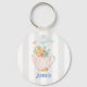 Porte - clé personnalisé avec une illustration fantaisiste. Une théière rose avec un petit coeur rose au centre et un bouquet de fleurs à l'intérieur. De délicieux papillons de couleur pastel floutent autour. Placé sur un arrière - plan rayé gris et blanc.