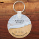 Un porte - clé avec la photo d'une plage de sable brun doré au surf mousse blanc.