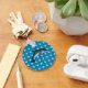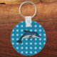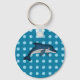 Ce porte - clé présente une illustration d'un dauphin. Le dauphin se trouve au-dessus d'un arrière - plan bleu avec des pois bleus plus clairs.