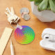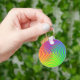 Voici un porte - clé coloré avec un motif arc-en-ciel en spirale abstrait tourbillonnant autour d'une cible centrale dans les couleurs vert, bleu, jaune, orange et rouge.