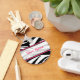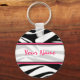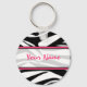Un porte - clé avec un arrière - plan d'impression zèbre noir et blanc et un garnissage rose chaud. Personnalisez avec votre nom sur la section centre.