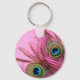 Belle porte - clé rose avec des plumes de paon colorées en gros plan.