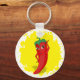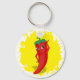 Un personnage de dessin animé rouge et poivre chaud. Design original avec arrière - plan de peinture jaune. Porte - clés personnalisés. Idée cadeau.