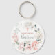 Baptême bébé/porte - clé de baptême. Ce dessin présente une illustration de courroie florale avec des roses rose pâle et des tiges vert feuillu en aquarelle avec des confettis d'effet doré et une image de croix.