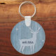 Porte - clé avec un arrière - plan en faux bois de couleur bleue. Le dessus est recouvert d'une silhouette de renne avec de gros bois.