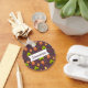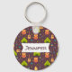 Un porte - clé avec un motif amusant sur le thème du camping. Placer sur un arrière - plan brun rougeâtre. Les éléments du motif comprennent un feu de camp, une tente, une guitare, une pelle et un sac à dos. Personnalisez avec un nom à l'intérieur d'un cadre / bannière en forme de ruban blanc.