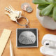 Un coquillage de sable d'un dollar repose sur la plage de sable avec l'éclairage doux du coucher du soleil. La lumière saisit la texture douce de la coquille de sable dollar. Photo en noir et blanc prise au Costa Rica à Playa Grande sur la côte Pacifique. Customisez ce porte - clé de plage de coquillages avec votre propre texte ou images pour un cadeau parfait en coquillages de mer!