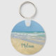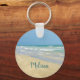 Un beau porte - clé de plage personnalisé dans le sable avec votre nom dans une typographie assez turquoise sous le mignon sandpiper debout au bord des vagues bleu vert de l'océan. Ce joli cadeau de fille de plage vous rappelle le bonheur de l'été.