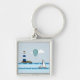 Porte - clé métallique disponible pour customiser avec une scène nautique d'un voilier naviguant dans un océan ondulé avec une montgolfière au-dessus flottant un phare.