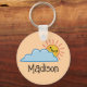 Porte - clé mignon avec un joyeux rayon de soleil jaune qui regarde à partir d'un grand nuage bleu avec un modèle ci-dessous pour ajouter votre nom, citation, texte ou supprimer pour laisser vide. L'arrière - plan est une jolie couleur pêche.