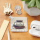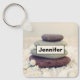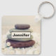 Porte - clé personnalisé avec une photo avec des piles de rochers les unes sur les autres. Entouré de rochers blancs et de petites fleurs blanches.