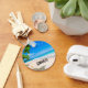 Un porte - clé avec une belle photo. Une plage de sable blanc à l'eau bleue azur. Image relaxante avec un ciel ensoleillé et un surf doux en mousse avec quelques mignons feuilles tropicaux encadrant l'image.