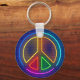 Graphic of a multicolored neon peace sign symbole against a brick wall background