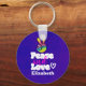 Un cool funky porte - clé personnalisé avec paix et amour écrit dans une police de typographie super. L'illustration est un symbole de paix en forme de main, les doigts soulevés dans le signe v classique, tous faits en couleurs arc-en-ciel. Un petit coeur de gribouillis à côté du mot amour. Design super psychédélique. Arrière - plan violet acide.