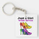 Colorée talons hauts, cette conception présente des talons hauts colorés et un texte disant "Juste une fille qui aime les talons".