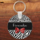 Un porte - clé animal noir et blanc tendance avec des rayures zébrées modernes en bas et un empreinte de léopard élégant en haut et orné d'un ruban rouge ceinturé attaché dans un arc. Personnalisez ce porte-clés de mode féminin chic en ajoutant votre nom. Image plate, pas le ruban réel.