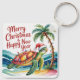 Une carte de voeux de Noël fantaisiste avec une aquarelle joyeuse illustrant une tortue de mer portant un chapeau de Père Noël festif et ornée de lumières scintillantes de Noël enfilées autour de sa coquille, posée sur fond de palmier balançant également éclairé par des lumières chaudes et un océan turquoise serein. La coquille de la tortue est peinte de motifs complexes de fleurs tropicales dans les tons pastel doux de corail, lavande et vert d'eau de mer, tandis que l'océan brille avec de subtils gradients de bleu et d'argent, créant une atmosphère paisible mais festive. "MERRY CHRISTMAS & HAPPY NEW YEAR" apparaît dans une police ludique et lettrée sur le dessus de la carte, avec l'intérieur offrant un espace blanc propre pour un message personnalisé et un motif subtil et répétitif de petits coquillages le long du bord inférieur pour renforcer le thème tropical. Le ton général est léger et joyeux, parfait pour envoyer des voeux chaleureux à des amis et à la famille pendant la période des fêtes.