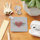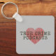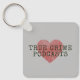 Un porte - clé pour les amateurs de podcast de crime partout, avec un coeur d'empreintes rouges avec texte style machine à écrire.