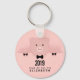 Porte - clé personnalisé célébrant le Nouvel An chinois. Un grand visage de cochon rose portant une cravate arc formelle. Levé par ses sabots noirs et regardant sur une table. Dessin mignon et fantaisiste. Placez-vous sur un arrière - plan rose aux coeurs défraîchis. Prêt à célébrer l'année du cochon 2019.