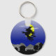 Chaud sorcière Halloween porte-clé parti. Une lune de croissant jaune surplombe une petite ville endormie où une sorcière glisse silencieusement au-dessus de son balai.