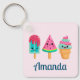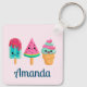 Un porte - clé avec une illustration de 3 gâteries différentes pour la crème glacée. Un coquelicot bleu-vert avec des gouttes de fraises et des arrosages colorés. Un popsicle de pastèque. Un cône avec des couches de délicieuses glaces en rose et menthe. Tous avec mignon kawaii sourit.