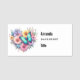 A name tag with a beautiful illustration. A heart-shaped bouquet of flowers in pastel blue, green, purple and yellow. With a lovely blue butterfly hovering in front.