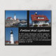 This postcard has three different photos of the Portland Head Lighthouse. One is a closeup of the old keepers house with the top of the tower in view above it. The second is a shot taken from coast line looking toward the lighthouse complex. The third is a closed in shot of the tower. This is the most photographed lighthouse in Maine. The GPS co-ordinance's are printed on the back.