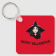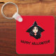 The front of the keychain shows the portrait of a young witch with long black hair and a black pointed hat on a red background, together with the words "Happy Halloween!". The keychain can be easily personalized.