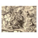 Engraving of the god Poseidon riding a dolphin or whale in the ocean with his apprentice sounding a conch shell like a horn. Engraving from the nether regions of a world map by Guido Gutiérrez printed in 1562.