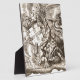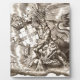 Engraving of the god Poseidon holding a shield with the Portuguese coat of arms and riding a dolphin or whale, from a world map by Guido Gutiérrez printed in 1562.