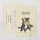 Fun wedding RSVP card. Sweet vintage bride cat holds a white rose wedding bouquet and Groom cat struts beside her with his black top hat. Ivory floral background. Customize text on back.