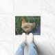 This door mat features a buff orpington hen posing on a bloulder near some pretty purple russian sage.