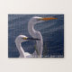 This Jigsaw Puzzle is an original photograph by ZoeSPEAK of two white, long necked shore birds posing by the deep blue waters of the ocean. The bird with the long, pointed black beak is a snowy egret. The bird with the long, pointed yellow orange beak is a great egret. There is text identifying the birds at the lower corner of the puzzle. This is set for you to personalize or delete if you prefer.