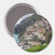 Round souvenir photo magnet of the small colourful village of Positano, built on a hill-top overlooking the Mediterranean Sea at the Amalfi coast, close to Capri, in Italy.